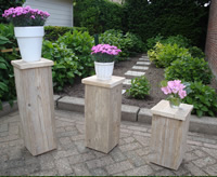 Deze steigerhouten plantenzuilen zijn zowel buiten als binnen in huis bruikbaar. Vervaardigd uit gebruikte of nieuwe steigerplanken en in elkaar geschroefd met RVS schroeven (voorkomt roeststrepen als deze plantenzuilen buiten gebruikt worden) De steigerhouten plantenzuilen op de foto's zijn 45 - 60 en 75 cm hoog.Meer info