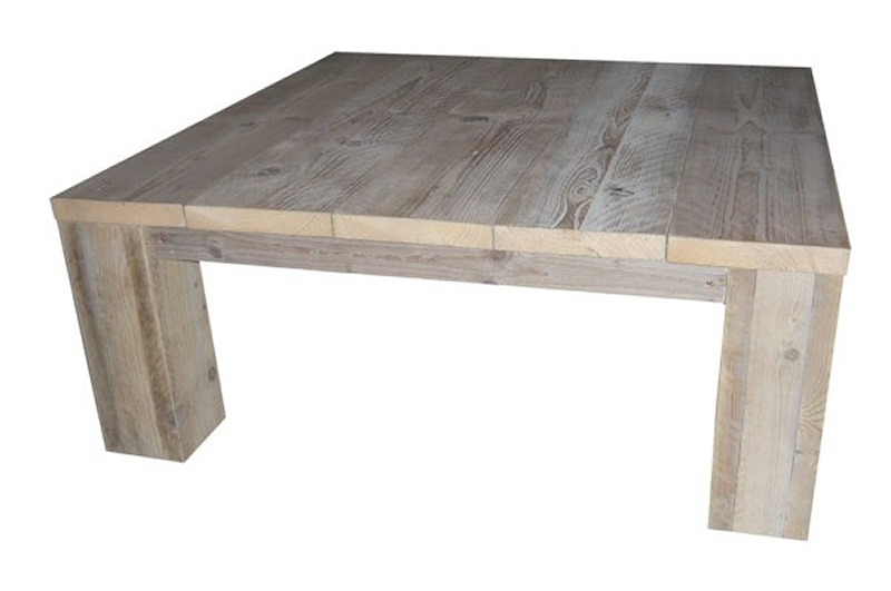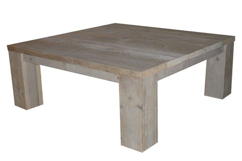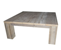 Salontafel Moos van gebruikte steigerplanken.Deze tafel heeft een hoogte van 40cm en de blokpoten meten 12x12cm.