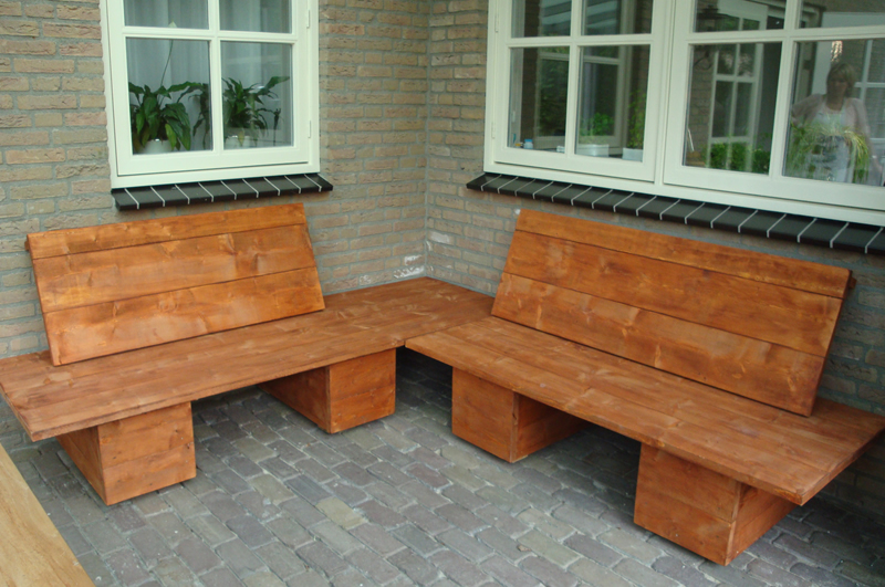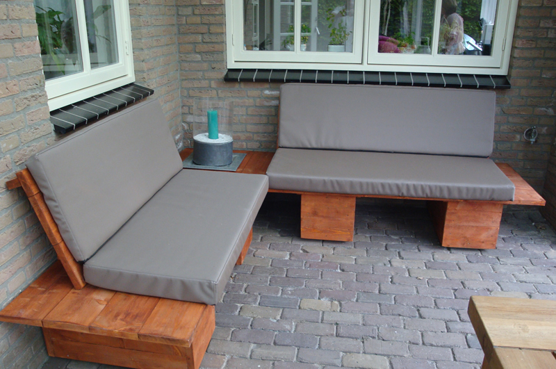 Een Loungebank geheel op maat gemaakt voor de klant. Vervaardigt van nieuwe steigerplanken en vervolgens in een teakkleur verfbeits geschilderd.