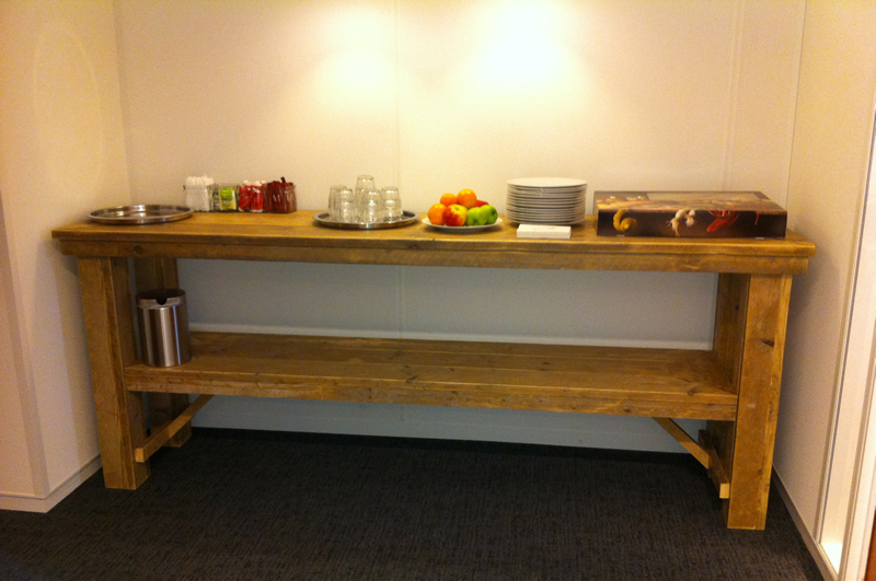 Speciaal voor deze klant en naar eigen ontwerp op maat gemaakte Side table van gebruikt steigerhout met dubbel blad en blokpoten van 10 x 10cm. De hoogte van deze tafel is 95cm. De steigerplanken aan de buitenzijde zijn in verstek gezaagd. De tafel op de foto heeft een afmeting van 240 x 60cm. Deze steigerhouten tafel is verkrijgbaar in zowel gebruikt als nieuw steigerhout en in (bijna) alle denkbare afmetingen.Prijs en afmeting alleen op aanvraag.