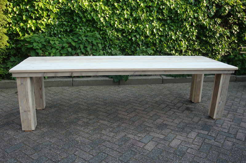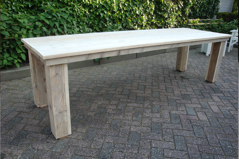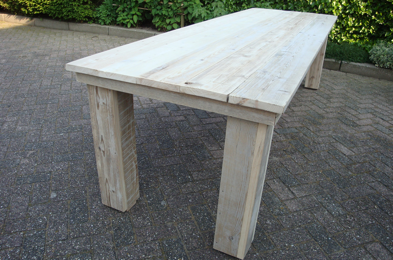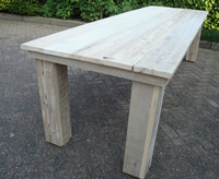 Een steigerhouten (eet)tafel, vervaardigd van gebruikte of nieuwe steigerplanken. Deze tafel is leverbaar met of zonder onderliggers (balkjes tussen de poten) Deze tafel is verkrijgbaar in vele verschillende maten.Meer info