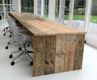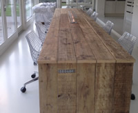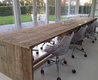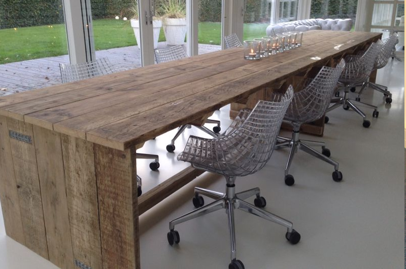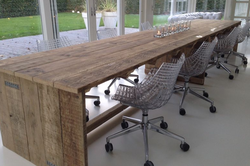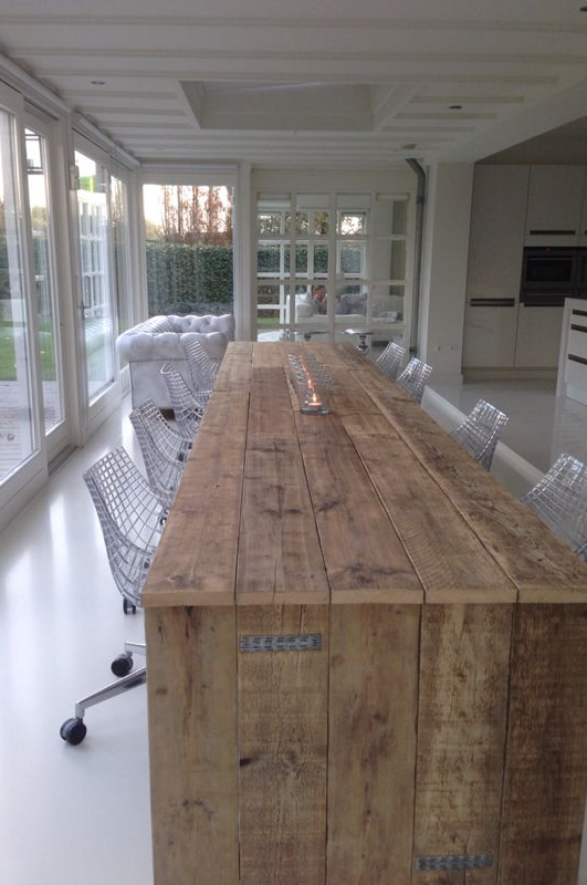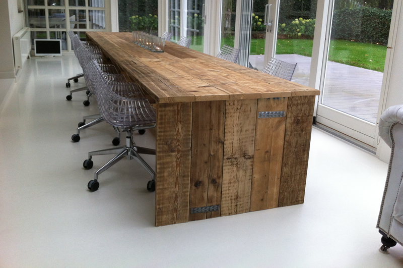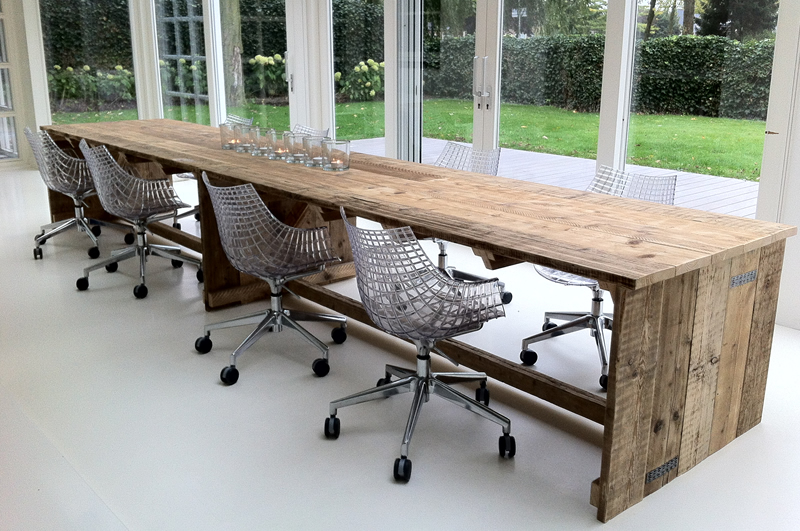 Op maat gemaakte tafel van gebruikt steigerhout en behandeld met een transparante beits. Deze tafel is 100x500cm, maar kan ook gemaakt worden in andere afmetingen.
