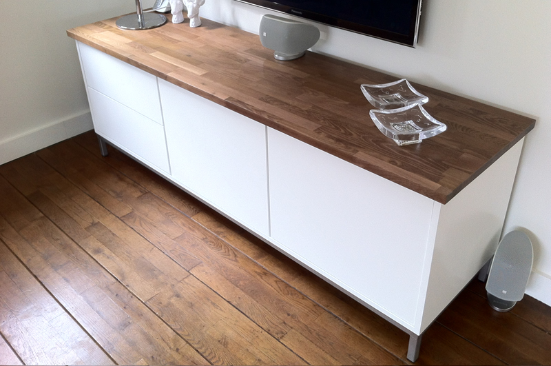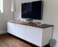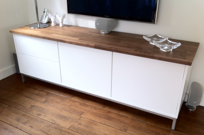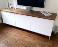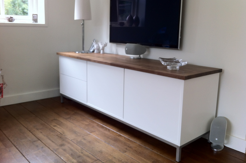 Dit meubelstuk is gemaakt aan de hand van een ontwerp van de klant en ook de maat is speciaal afgestemd op de plaats waar het TV meubel moest komen te staan. De ombouw en de deurtjes zijn gemaakt van 18 mm MDF en geschilderd in RAL 9010 (wit) zijdeglans. Het blad is van 28 mm dik gestoomd Akazia. Het geheel staat op een onderstel van geborsteld RVS en pootjes van 10 cm.Prijzen en afmetingen alleen op aanvraag.